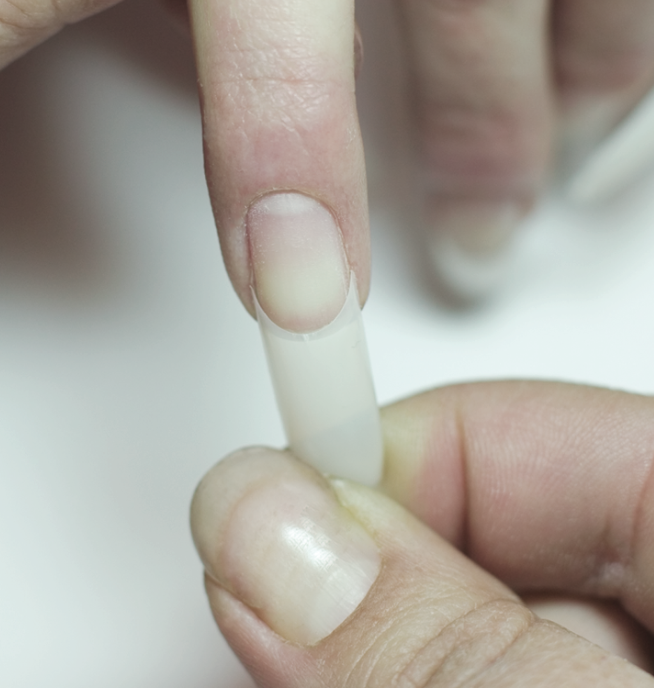 Tips are essentially pieces of moulded plastic. There’s different types of tips that nail techs use. They are relatively quick to apply using a special glue. Nail tips need to be sized properly to fit your natural nails, and this is where problems most often arise. There’s no one size fits all solution, and each tip needs to be altered for a custom fit, making sure that there’s no gobs of glue squeezing out from under or around the tip. It’s very important not to feel an intense pressure on your nail plate after the tip has been glued on. Using pre-made nail tips makes the process of building up your nail extension a lot faster, saving both you and your manicurist precious time, and we know all too well: Time is money.